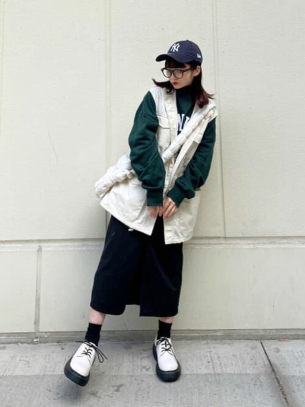 ミリタリーベストでカジュアルガーリーに。 小物はホワイト、全体的に暗いトーンでまとめて統一感を出しました!
