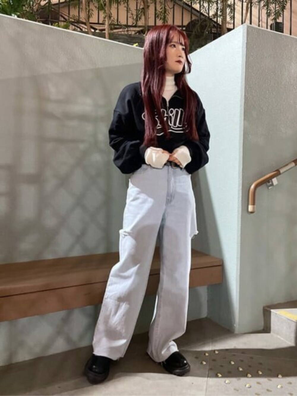 カジュアルスタイルです! アームカバーニットをスウェットのインナーに着て袖をのぞかせました◎ シンプルですがデニムのサイドカットがポイントになります!◎