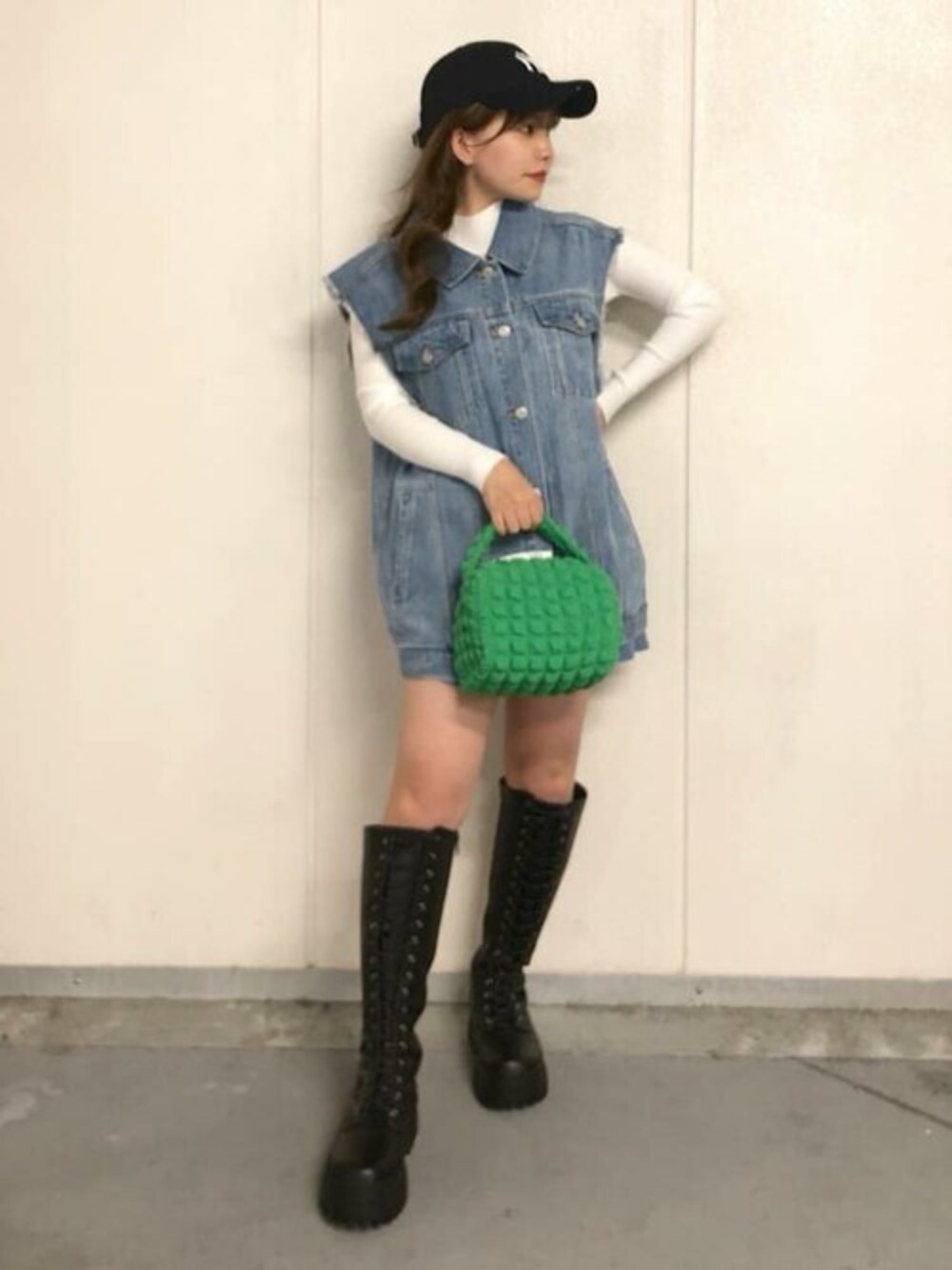 デニムのセットアップ風にして差し色で緑のバッグを合わせました! 今年っぽいコーデでおすすめです!