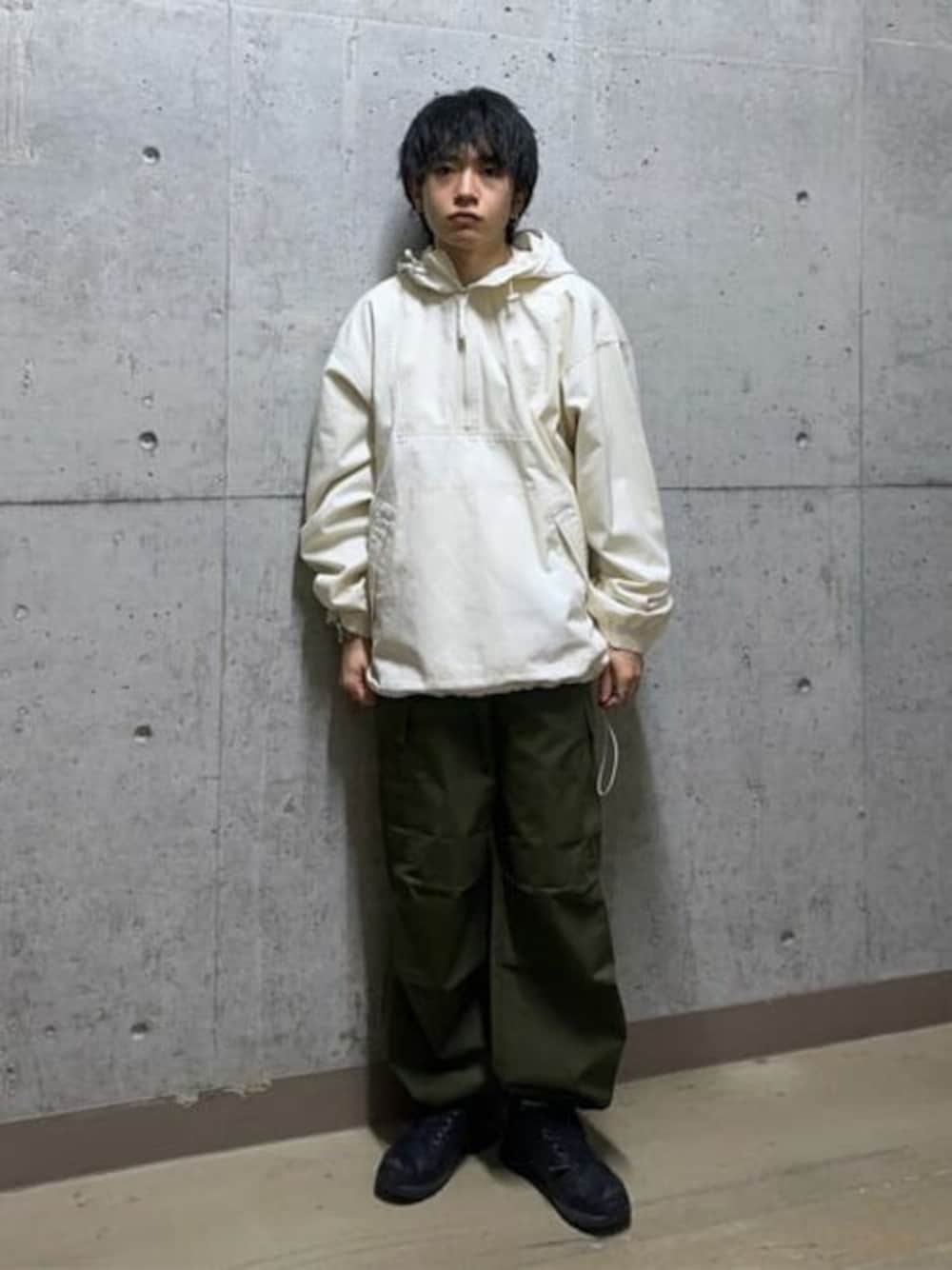 春らしい色味でスタイリング。 アノラックパーカーはボリュームのある袖と身幅のものがオススメです。 wegoのものはそれに加えて、裾部分が絞ることができるのでシルエットを変えれるので楽しみ方が幅広いかと思います。