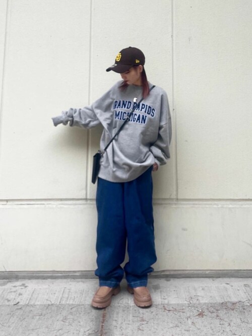 オールメンズコーデ。 ボトムスは下に行くとシルエットが締まるタイプのデニムパンツです。 どちらもユニセックスアイテムです。 スウェットは元々大きめですが、もっとだぼっとしたい方はLサイズがお勧めです。