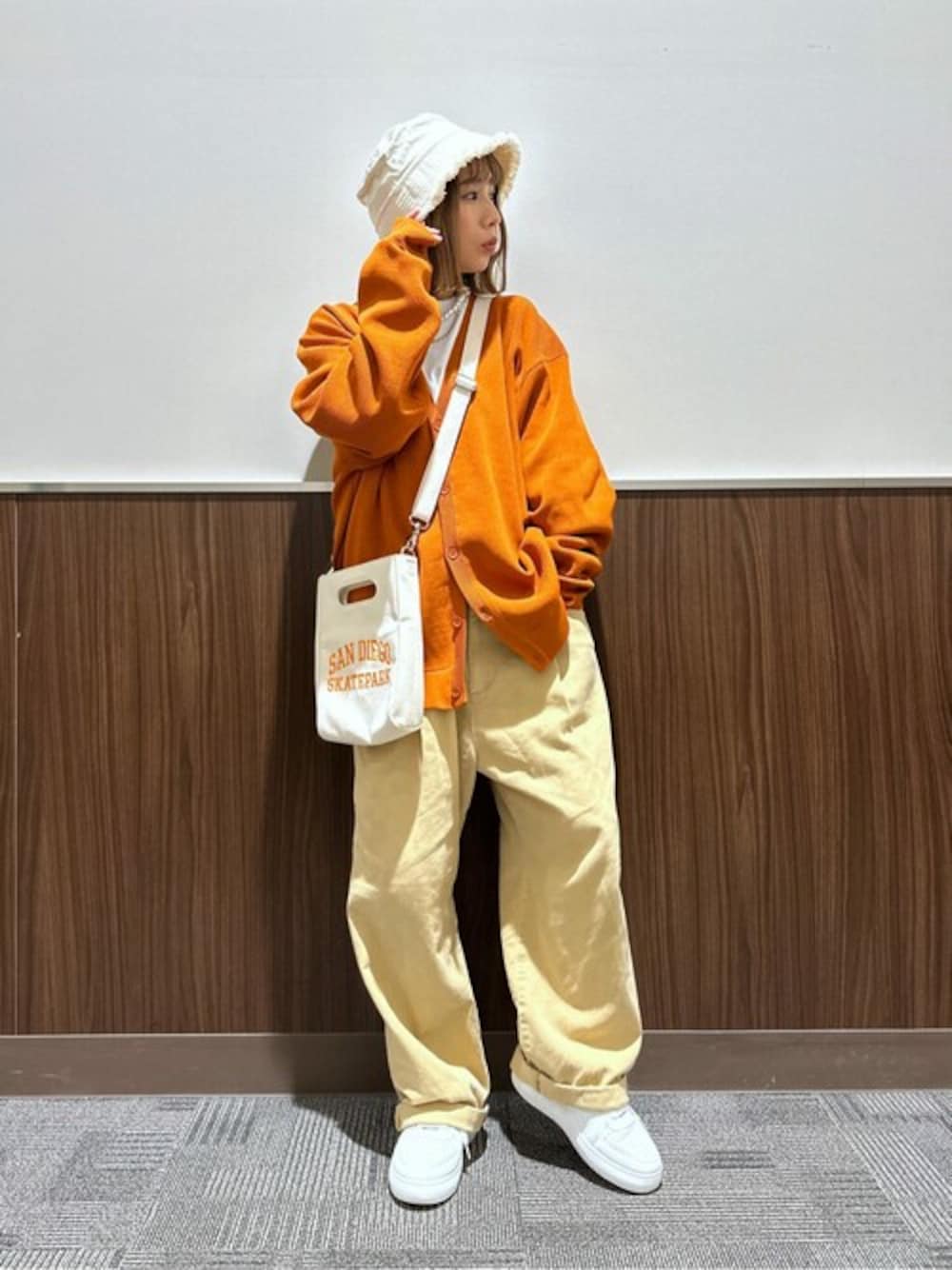 オレンジ×ベージュカラーの組み合わせが可愛さ◎のラフコーデ(^O^)❤︎❤︎ ボトムスはメンズアイテムですがウエストに紐があるので絞ったら女の子でも着用可能♪ オーバーサイズ感が可愛さ◎♪