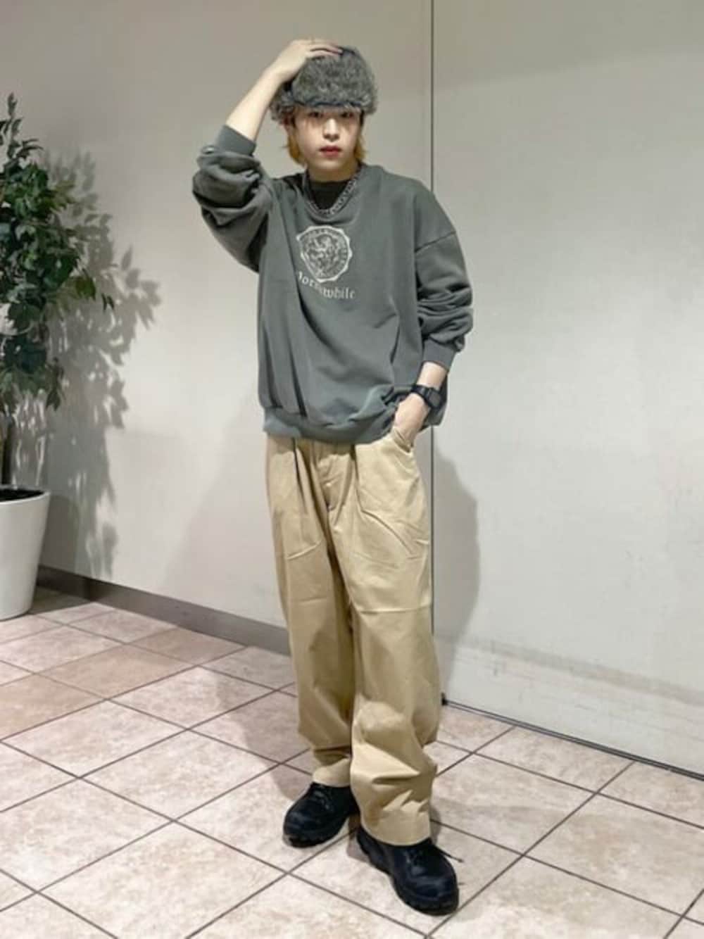 使い勝手の良いベージュのチノパンツは春先も大活躍です。ヴィンテージ風のスウェットと合わせることで古着っぽく着ることができます◎