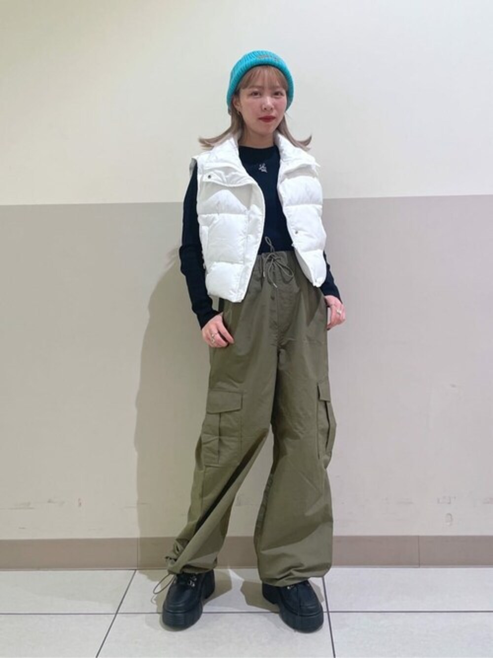 春はやっぱりベスト! ショートな丈感がスタイルアップ効果◎ ナイロンカーゴパンツは軽くて履きやすく 動きやすいです^ ^