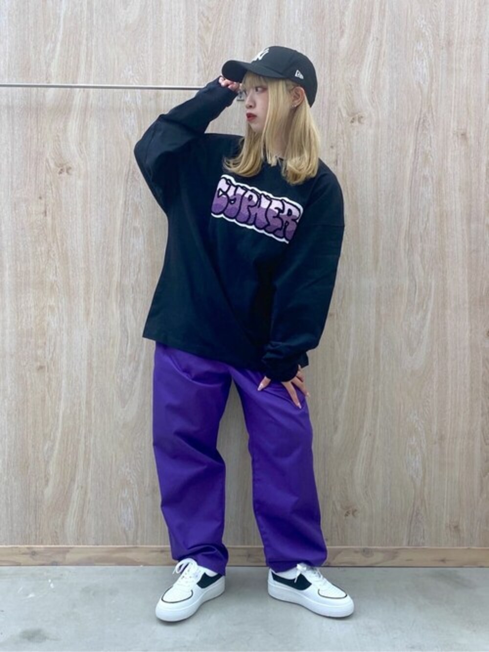 ストリートといえばカラーパンツ!みたいなところありますよね! ロンTのワッペンとパンツのカラーを揃えるだけで統一感が出て、 色物の合わせが不得意な方にもチャレンジしやすいです! トップスをオーバーサイズ、ボトムスをスリムな合わせはバランスが取りやすく外れないスタイリング間違いなし!