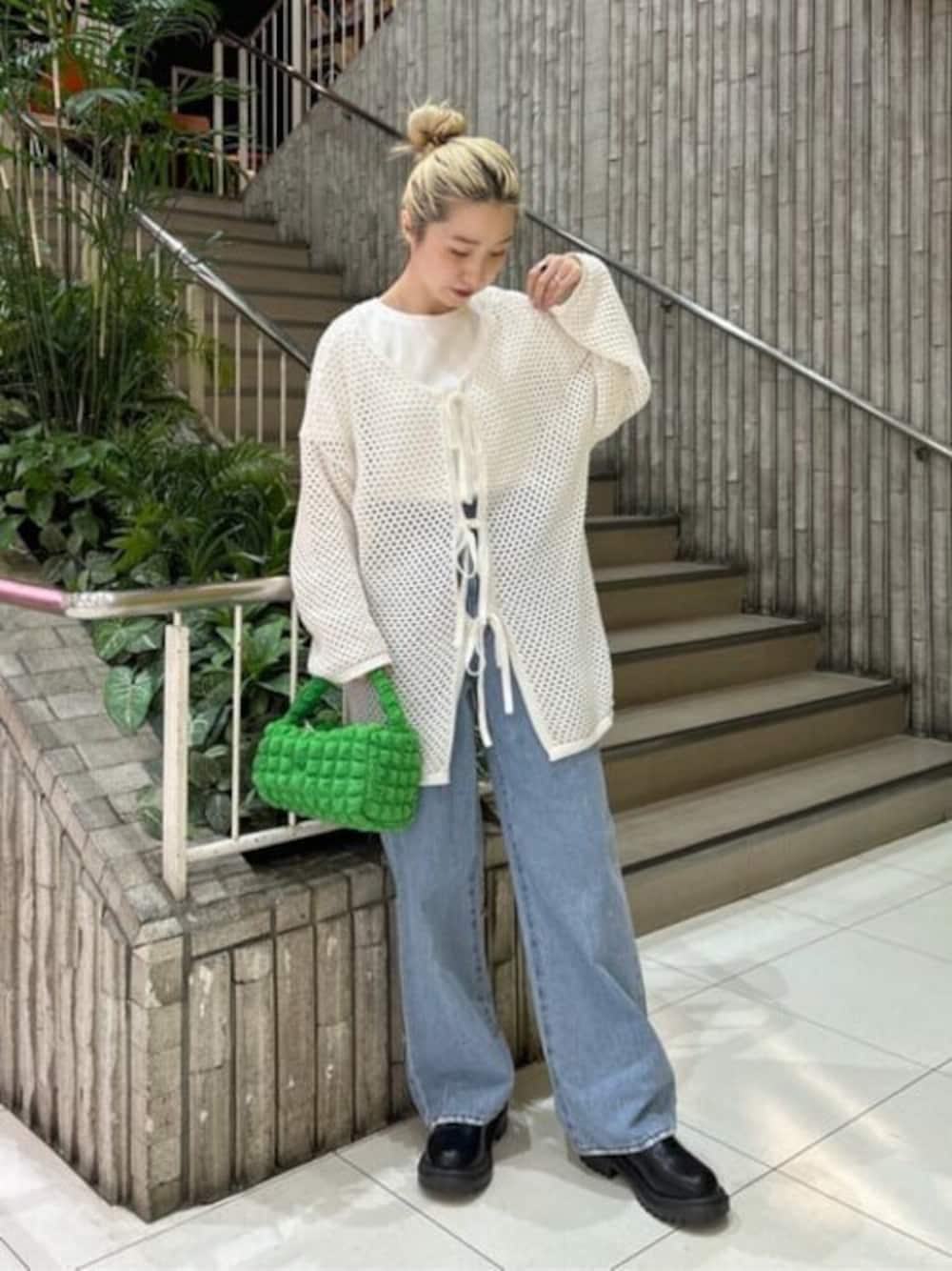 メッシュカーディガンは2WAYで前後ろで着られるので インナーに合わせて着方を変えられておすすめ☺︎ デニムはSサイズ着用しています! ポップコーンバッグは小さめでもポーチと財布と携帯が入るくらいのちょうど良い大きさです!