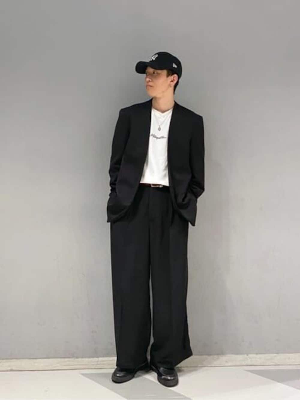 ノーカラージャケットとワイドスラックスでセットアップコーデ!! 簡単にかっこよくなってモテ間違いなし! キャップでキレイめ過ぎないようにするのがポイント! おすすめです!!