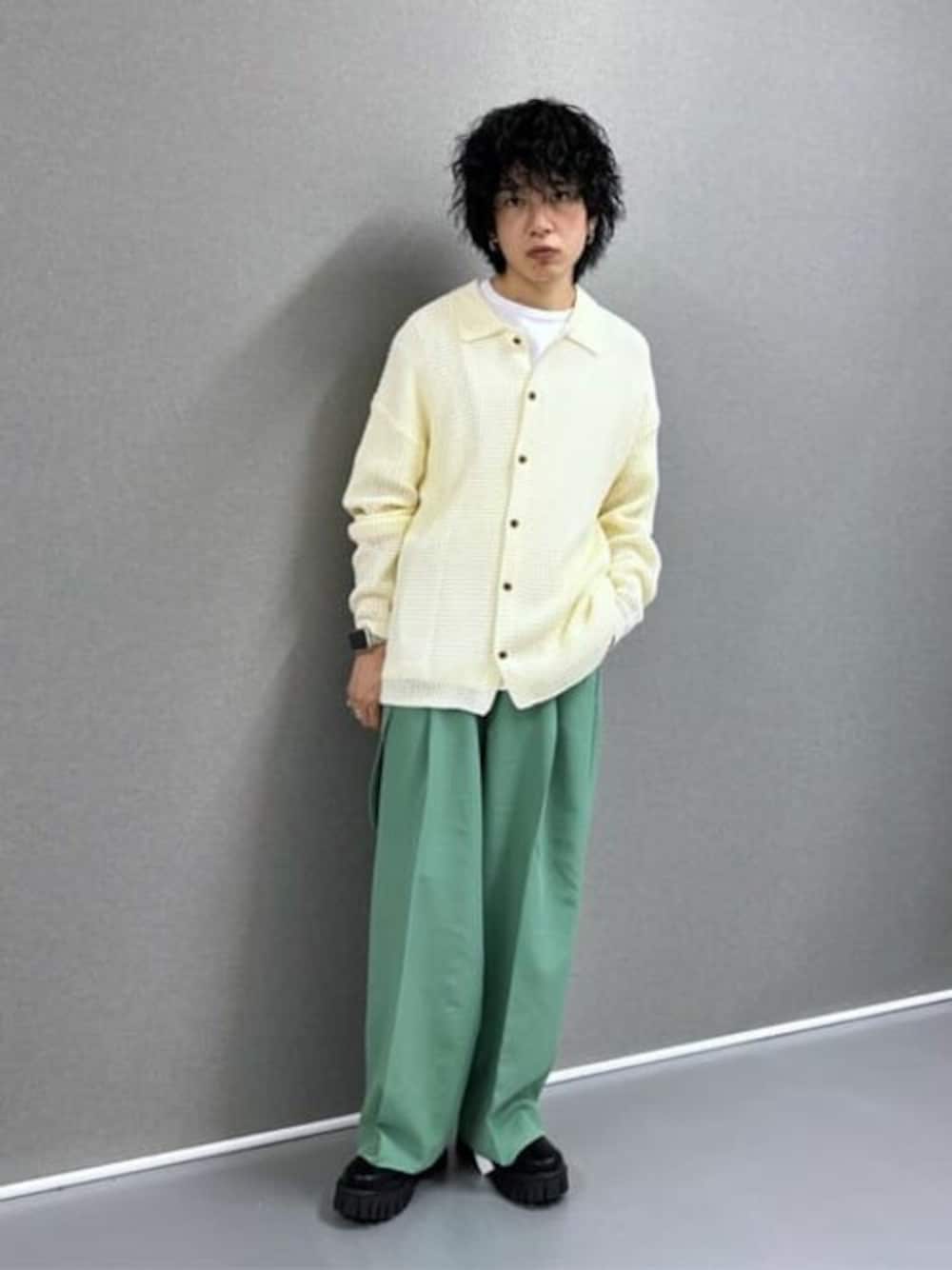 春らしいカラーリングのコーデ。 メッシュニットシャツはインナー次第でオールシーズンに使えるアイテムで着回し力抜群です。