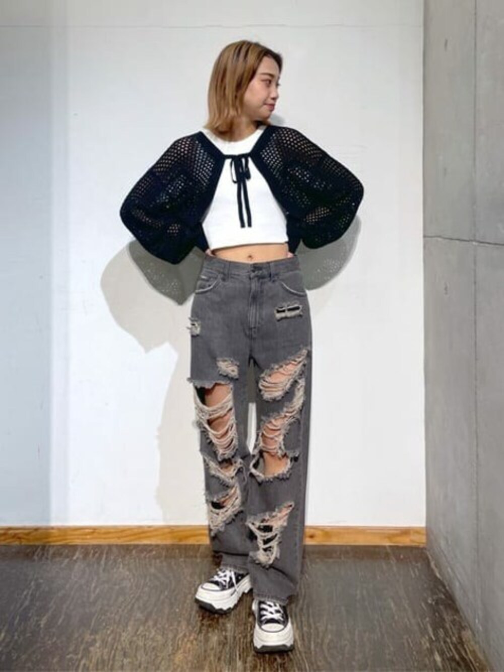 今回は前りぼんメッシュカラーボレロを使った韓国コーデです!! 合わせやすいのにコーデのワンポイントになって、一気にオシャレ感が増すのでとてもおすすめのアイテムです!! ショート丈なので脚長効果抜群です!!
