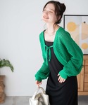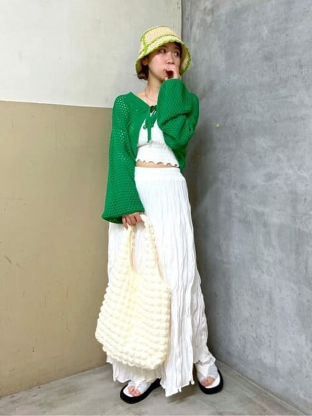 シンプルながらワッシャー加工で動きを付けたWCの新作スカートのコーディネート。 ぽこぽこのトートバッグや素材に変化のあるアイテムがトレンド! アクセントになるぱきっとしたグリーンのボレロでコーデがグッと引き締まります。