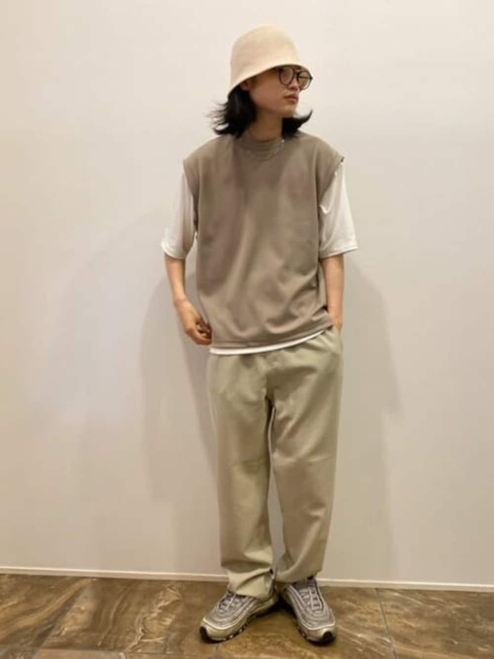 ベージュアイテムを全身で使ったコーディネートです! ベストはアンサンブルで、カットソーとセットになっています! スラックスはリネンライクで軽く、イージーパンツなのでベルトいらずで着用できます! 上下で同系色でまとめてWEGOで大人コーディネートを楽しんでください!