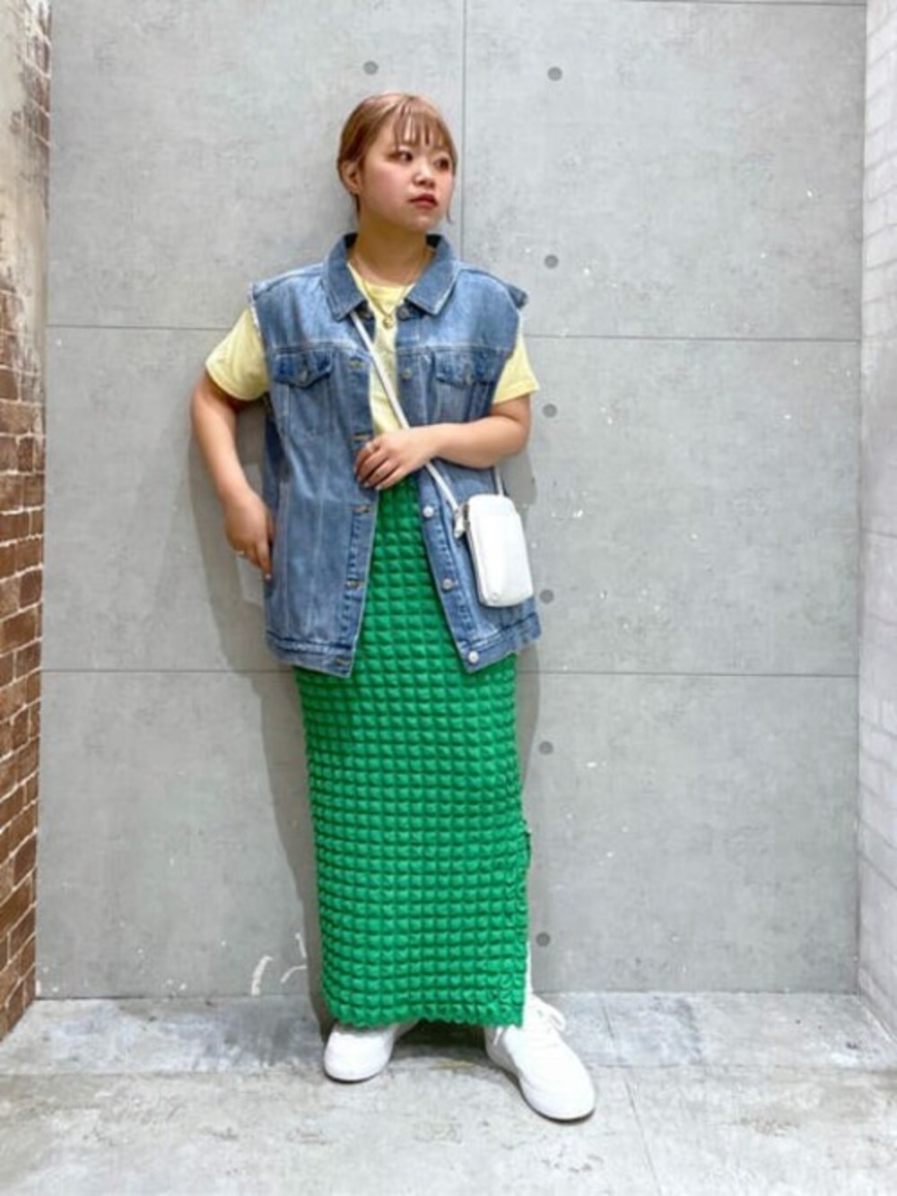 ご覧いただきありがとうございます!♡ 🥦🍋🦕 レモン色のTシャツにグリーンを合わせてビタミンカラーコーデ💭 デニムベストを合わせるだけで抜け感もでるのでおすすめのアイテム。