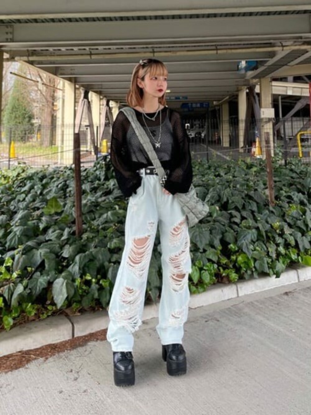 透け感がおしゃれなメッシュニットは今季のいちおしアイテム☆ ダメージデニムと合わせて韓国ストリートコーデを意識しました♪ ライブにもおすすめのコーデです✌