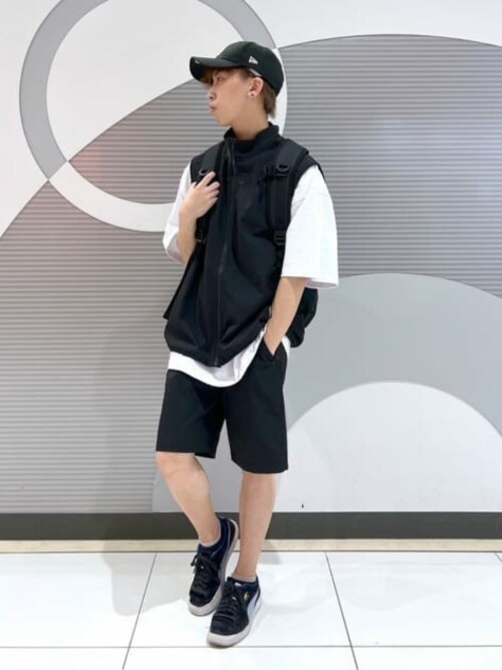 ホワイト×ブラックのシンプルコーデ! ベストとショートパンツはセットアップでも楽しめるし、別々でも着まわせる夏オススメアイテム! この二つはイージーケアアイテムでシワになりにくく、すっごく軽い、通気性抜群と夏にうってつけのアイテムですよ!
