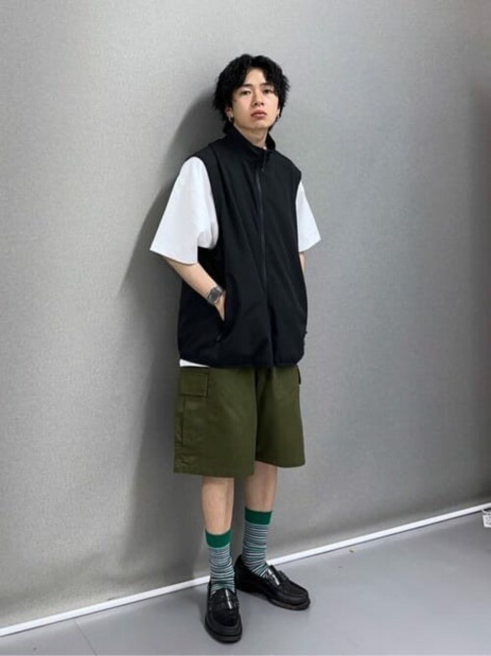 テックベストは、夏の単調になりがちなスタイル作りに雰囲気をプラスさてくれます。 ミリタリー要素の強いカーゴショーツを合わせて無骨なスタイルにしてました。