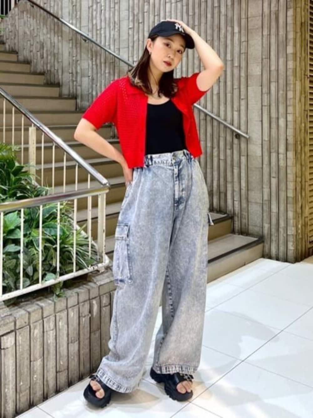 ボリュームのあるボトムには、華奢なアイテムが相性いいです!!目を惹く赤のトップスで大人のカジュアルコーデです。