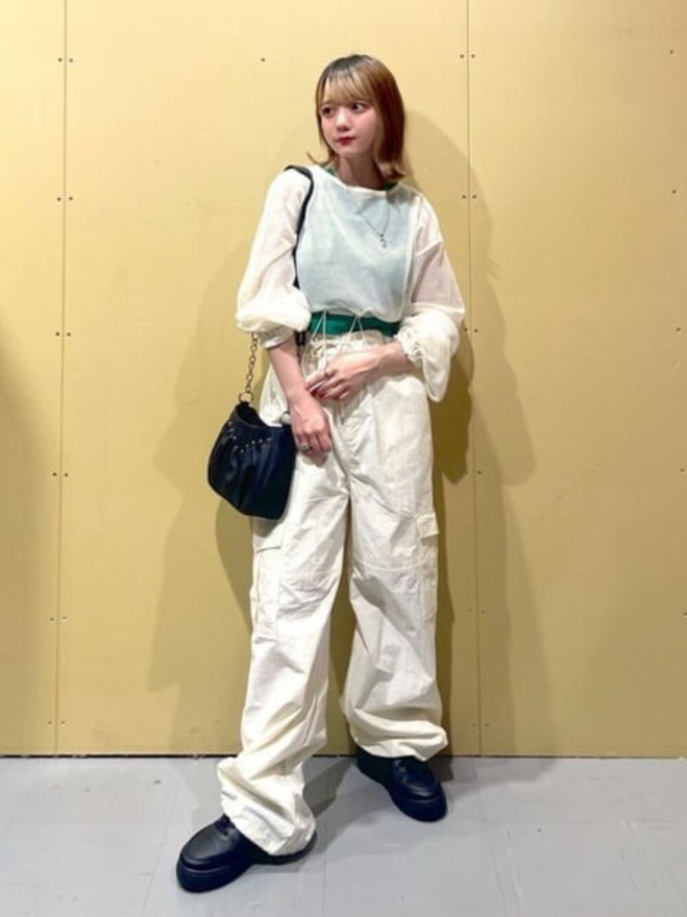 オールホワイトに差し色でグリーンコーデ ・全てFサイズ ・メッシュは紐調節がついており裾を引き締めることもできます!! ・カーゴパンツも裾絞れるので低身長の子でも気軽に履けます◎