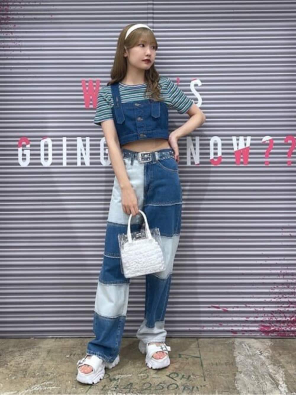 新作のデニムビスチェを足したコーデ! バッグは夏っぽくクリアバッグに!!! サンダルも履いてさらに夏っぽく^ ^ ビスチェの下からリブT出てるのはあんまりだったので、 見えないようにしました! 女の子っぽさを出すのに、バッグはかわいいものを♡ バッグに合わせてサンダルもカチューシャも ホワイトで統一!!