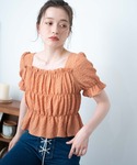 夏らしいブラウスとデニムを合わせたコーデです! ブラウスシャーリングになっているので1枚で可愛く着こなせちゃいます💗 レースアップデニムで女の子らしさもアップ♪