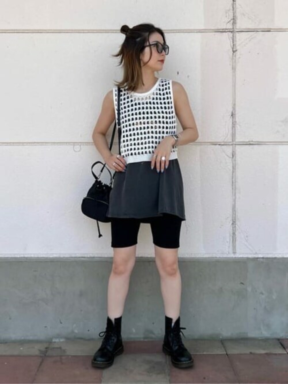 荒目の網目が可愛いメッシュニットタンク!! 短めトップスとはもちろん 長めのトップスとレイヤードしても可愛い♡ ハーフレギンスは伸縮性良く動きやすさも抜群 バッグは2WAYで使えて重宝します◎