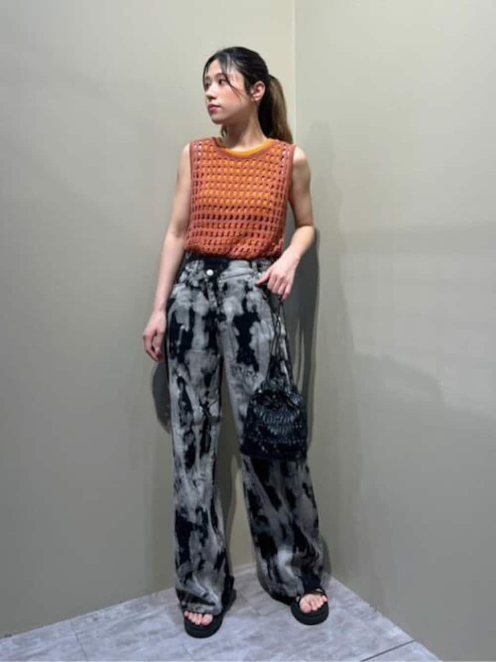 新作のブリーチパンツを使った、大人カジュアルコーデ❤️🔥 今季トレンドの、メッシュ素材のタンクトップにブリーチパンツで、トレンド感満載のスタイルに挑戦してみました☆ ブリーチパンツはアシンメトリーデザインのウエストのディティールがかわいいアイテム。 タイダイ染めなバギーシルエットなので、着丈のコンパクトなトップスとの相性が〇 少し個性派の方におすすめとなっております💁🏻♀️