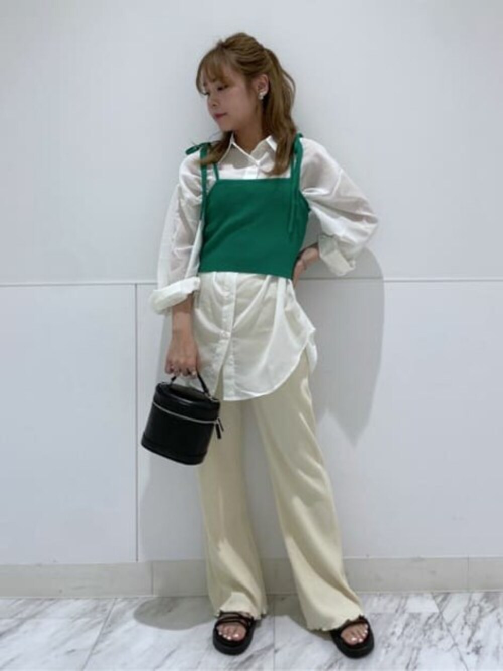 【トップス】フリーサイズ ボリューム袖が可愛いシアーシャツ! 定番カラーから春らしいチェック柄の6色展開! ポリエステルの素材で、自宅で洗濯をしてもシワになりにくいのも嬉しいポイント◎ インナーを変えることで長い間ご着用頂けます! 【ビスチェ】フリーサイズ コーデのアクセントになるニット素材のビスチェが登場! 肩リボンデザインになっているので丈の調節も可能です♫ 【ボトムス】フリーサイズ ウエストはゴム使用でストレスフリーな着心地! フレアなシルエットで美脚効果◎ 体のラインを拾いすぎないワイドシルエットとリブデザインです♫ 【バッグ】 小箱の箱状のデザインがスタイリング全体をオシャレに見せてくれる高見えバッグ◎ シンプルなスタイリングにも映えやすく、気軽に持ちやすい万能アイテムです!