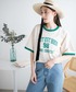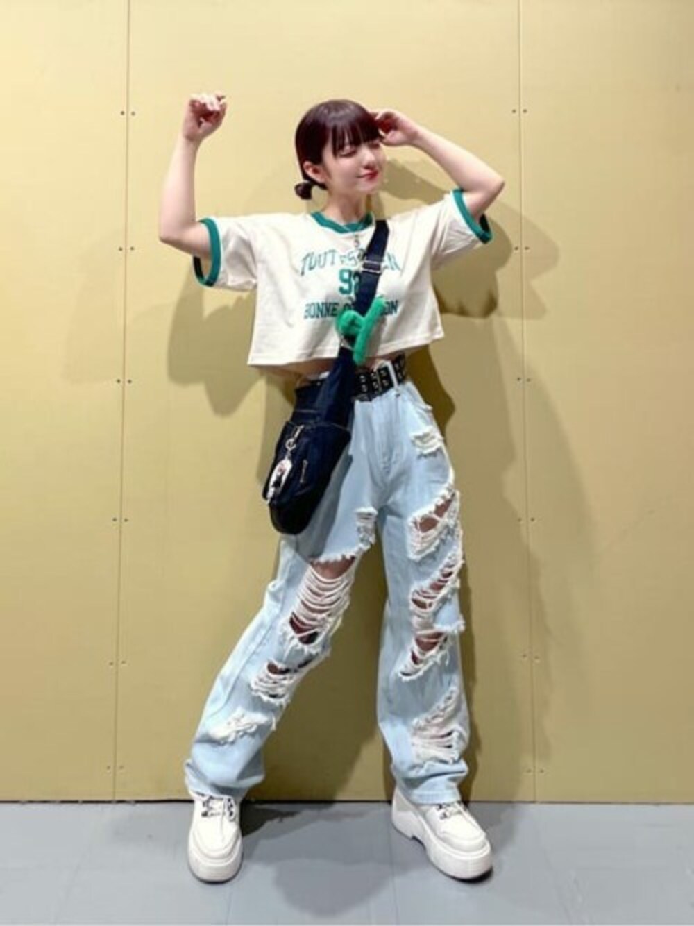グラフィックショートTに ダメージデニムの組み合わせが人気!! きれいにAラインを作るためには小さめサイズがオススメ!!低身長の子はSがおすすめ! Mはあまりお腹は見えないです。 お腹出したくない方はハイウエストパンツと組み合わせるのがいいです