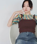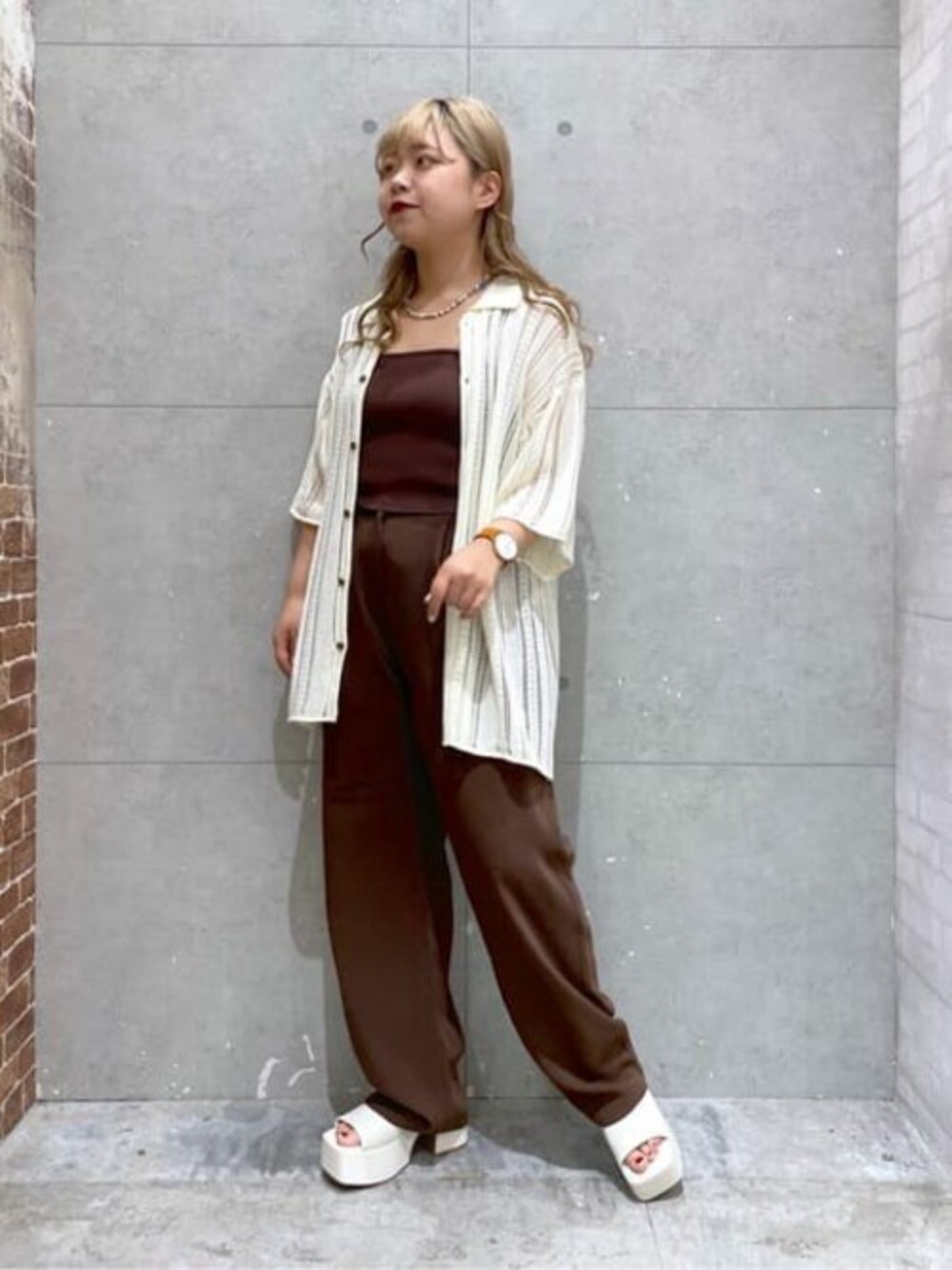 🍪🥛🍩 インナーとパンツをブラウンで統一させて、 メッシュシャツとサンダルはホワイトでまとめた大人カジュアルコーデ。 ニットビスチェはTシャツなどの上に重ねるももちろん◎! インナーとしてもかわいくて着回しできておすすめ!