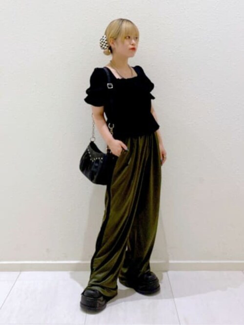 大人カジュアルコーデ ・クリンクルシャーリングブラウス(Fサイズ)と あえてのラインサテンパンツ(Fサイズ)でガーリーなブラウスも落ち着いた大人な印象に! サテンパンツは着心地良く、めちゃくちゃ動きやすいです! 裾にチャックが付いてるので雰囲気を変えて履くことも出来ます! 丈感は結構長めなので、私は10センチ厚底の靴合わせてます!
