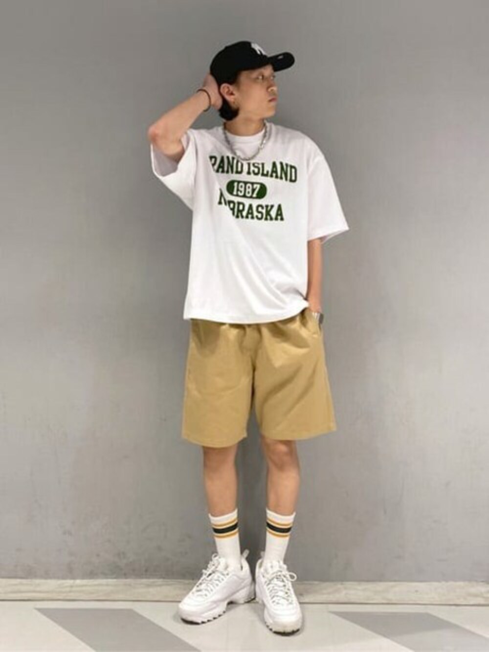 グラフィックTとチノイージーショーツを使って、夏にぴったりストリートコーデを組んだよ!! Tシャツは種類豊富で、着回ししやすいし、 白Tは夏に必須だから絶対ゲットしといて!!