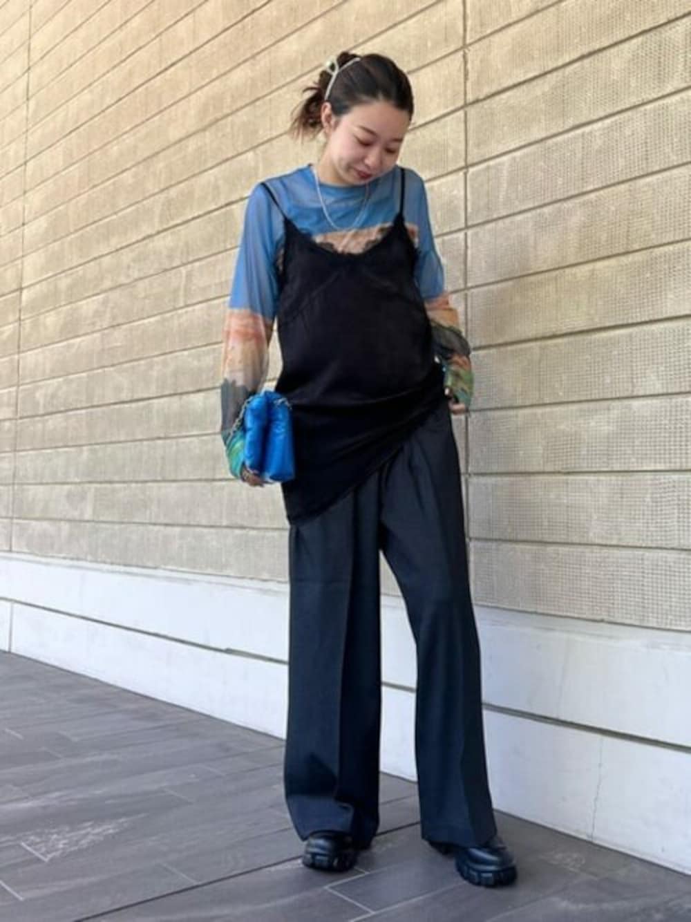 ブルーとブラックを使ったキレイめコーデ. 程よいワイドで、楽ちんなのにシルエットがキレイで高見えするパンツが一押し!! シアーのロンTは、柄が豊富で好きなものを 見つけてね☺︎