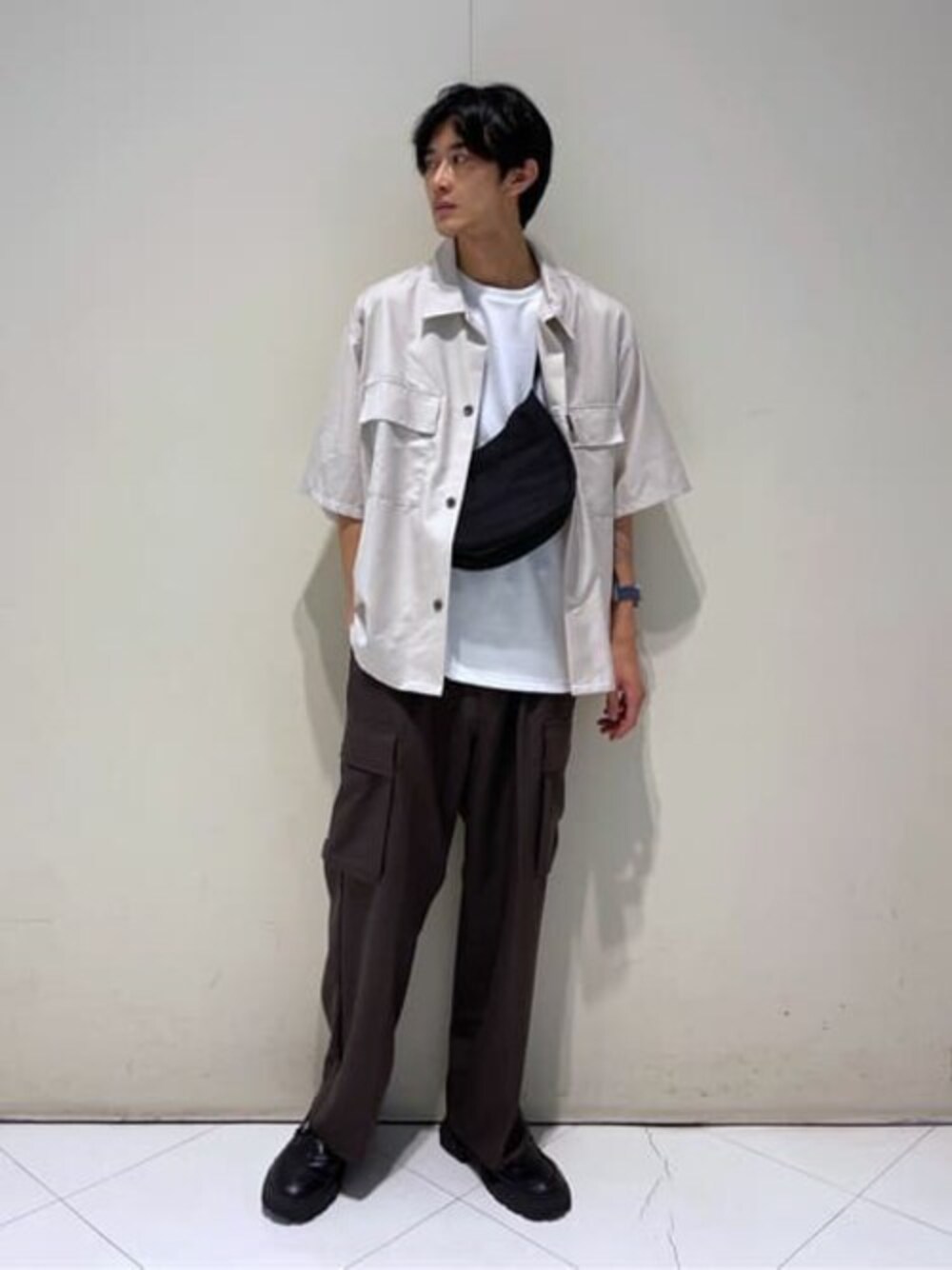 新作カーゴスラックスを使ったキレイめコーデ!! クリーン×ミリタリー感のあるカーゴパンツの融合型で、今のトレンドのワイド型になって登場しました! ポケットがアクセントとしてなるため、機能性はもちろん装飾性として発揮するのでトップスがシンプルなTシャツでもカッコイイです!夏にもってこいボトムス!! シャツがサラサラした素材になっていて生地感も柔らかいので楽に羽織れたり、シャツとしても使ったりと着回しがしやすいアイテム。セットアップとしても着用可です!