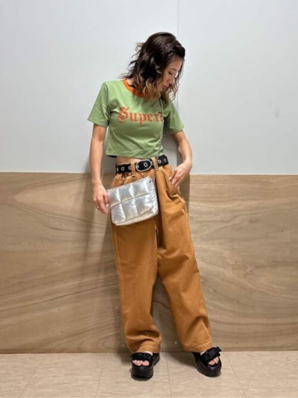グリーン×ブラウンで個性的な合わせコーデ(^O^)❤︎❤︎ トレンドのリンガーTがちびTなのが90年代風で可愛さ◎のおすすめアイテム♪ ボトムスはメンズアイテムですがウエストが紐でしぼれるので無問題! ステッチデザインが可愛さ◎です❤︎