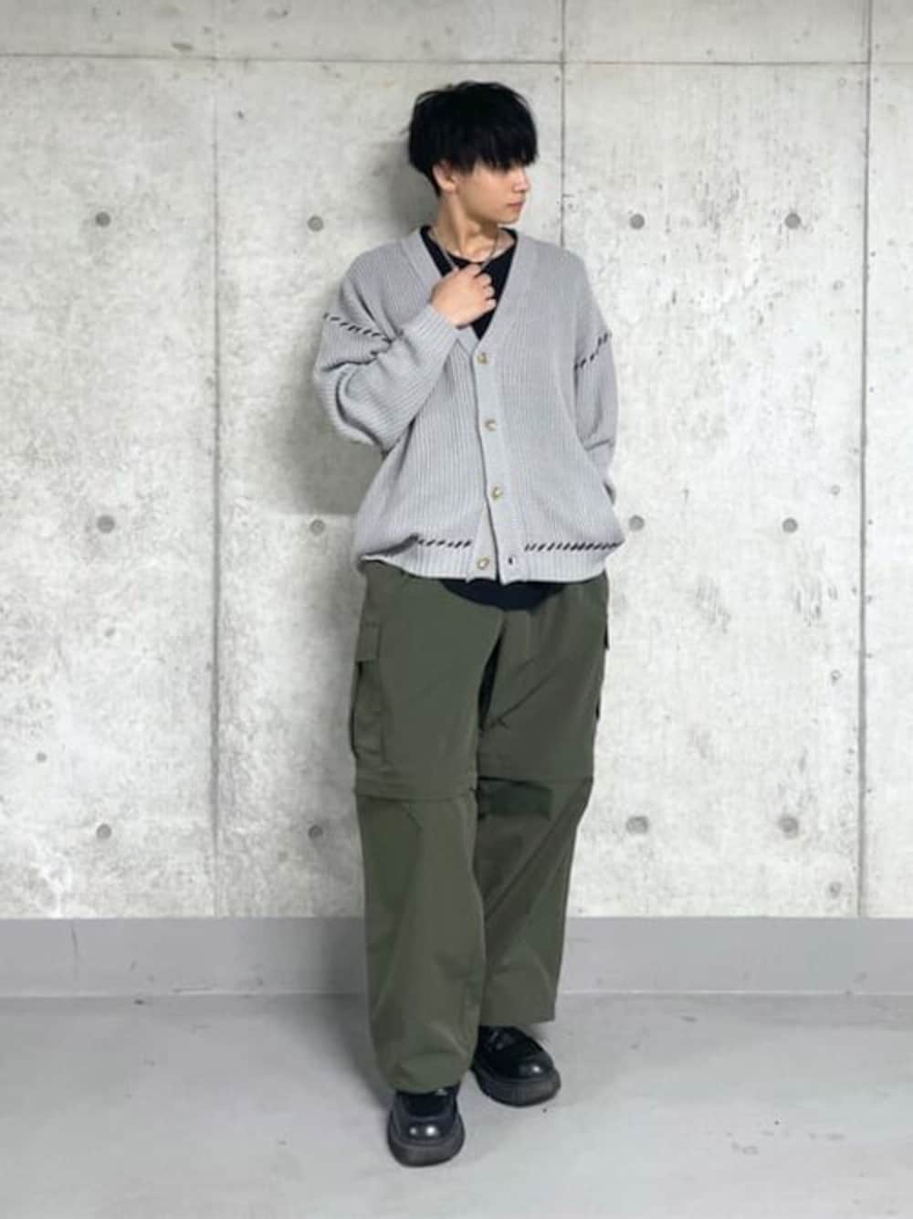 カーディガンとカーゴパンツを取り入れたストリートコーデ!!! ブラックのインナーをアクセントに、グレーのカーディガンを羽織りました!!! サイズ感は全体的に大きめで、少し重量感のあるアイテムです!! キレイめ、カジュアル、ストリートなどにも応用でき、秋コーデにオススメです!