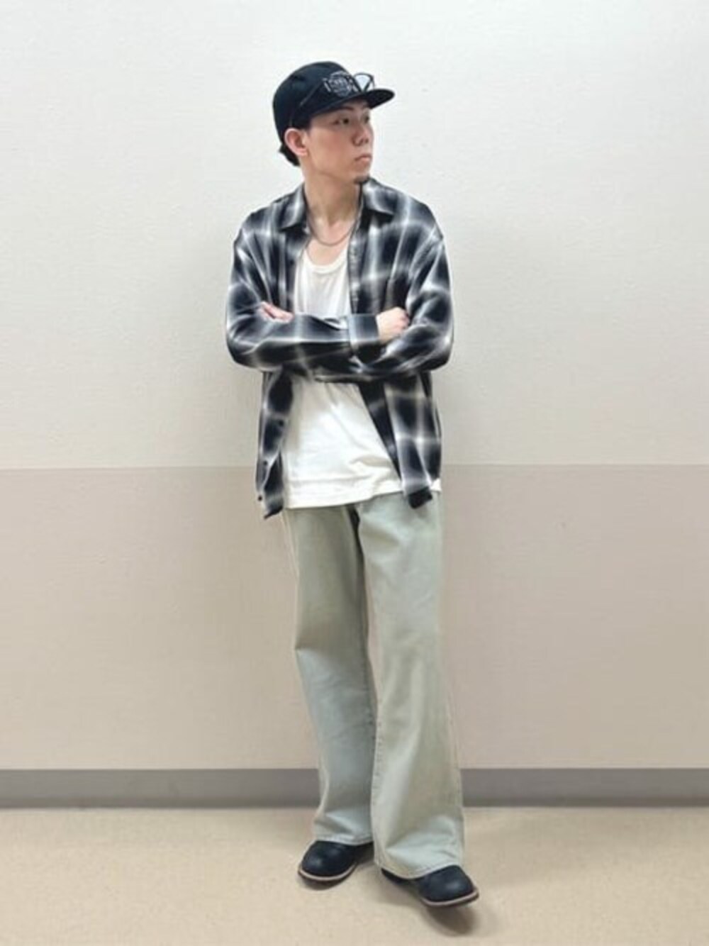 新作のチェックシャツを使って、ラフなカジュアルコーデです!タンクトップの羽織に持ってこいな色味、サイズ感なのでおすすめです!たすき掛けで使うのにも是非!