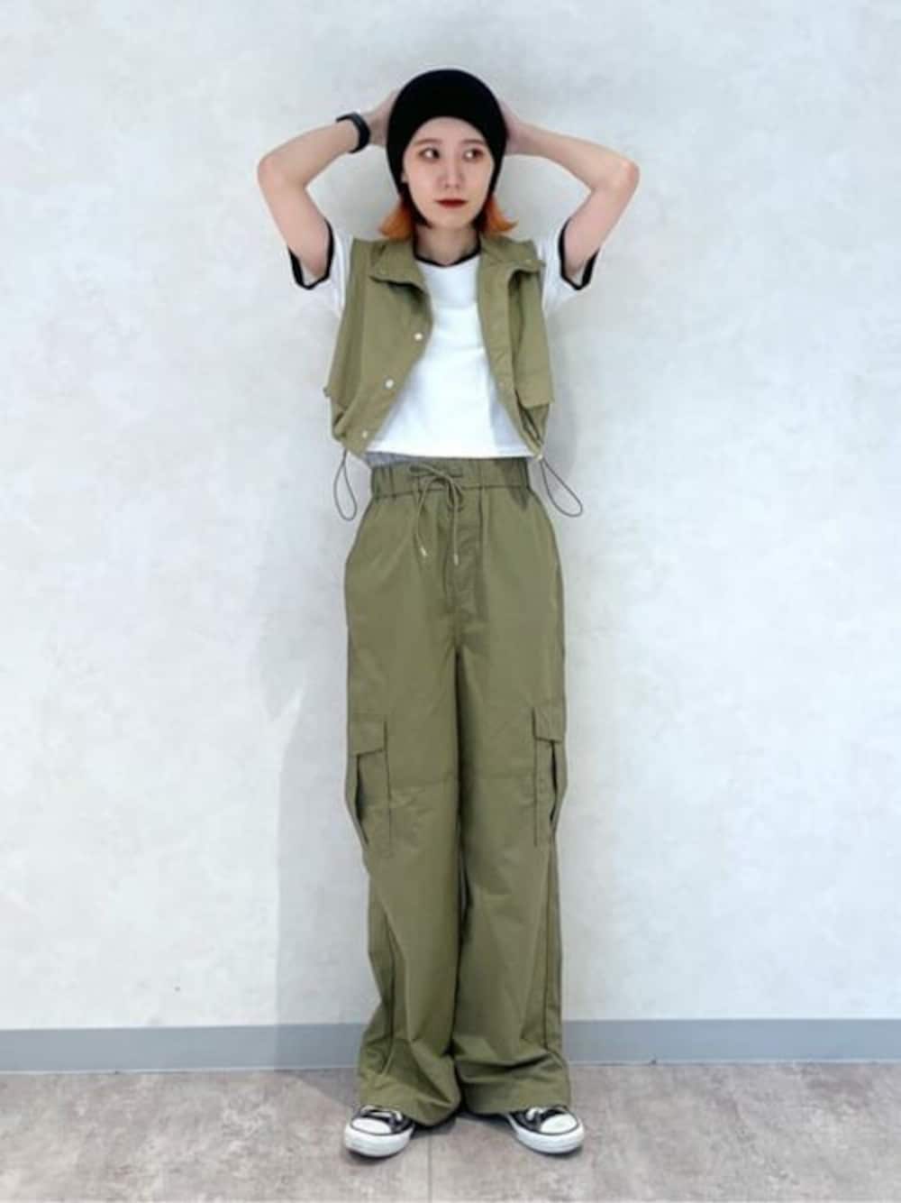 ナイロンベストはリアルバイアイテム! サイズ感がかわいすぎる!!! カーゴパンツとセットアップ風に着てみました◎ カーゴパンツはウエストがゴムになっているので 履きやすい!裾も紐で絞れます! ショートTはサイズ展開もカラバリも豊富なので1着持っておくと便利!