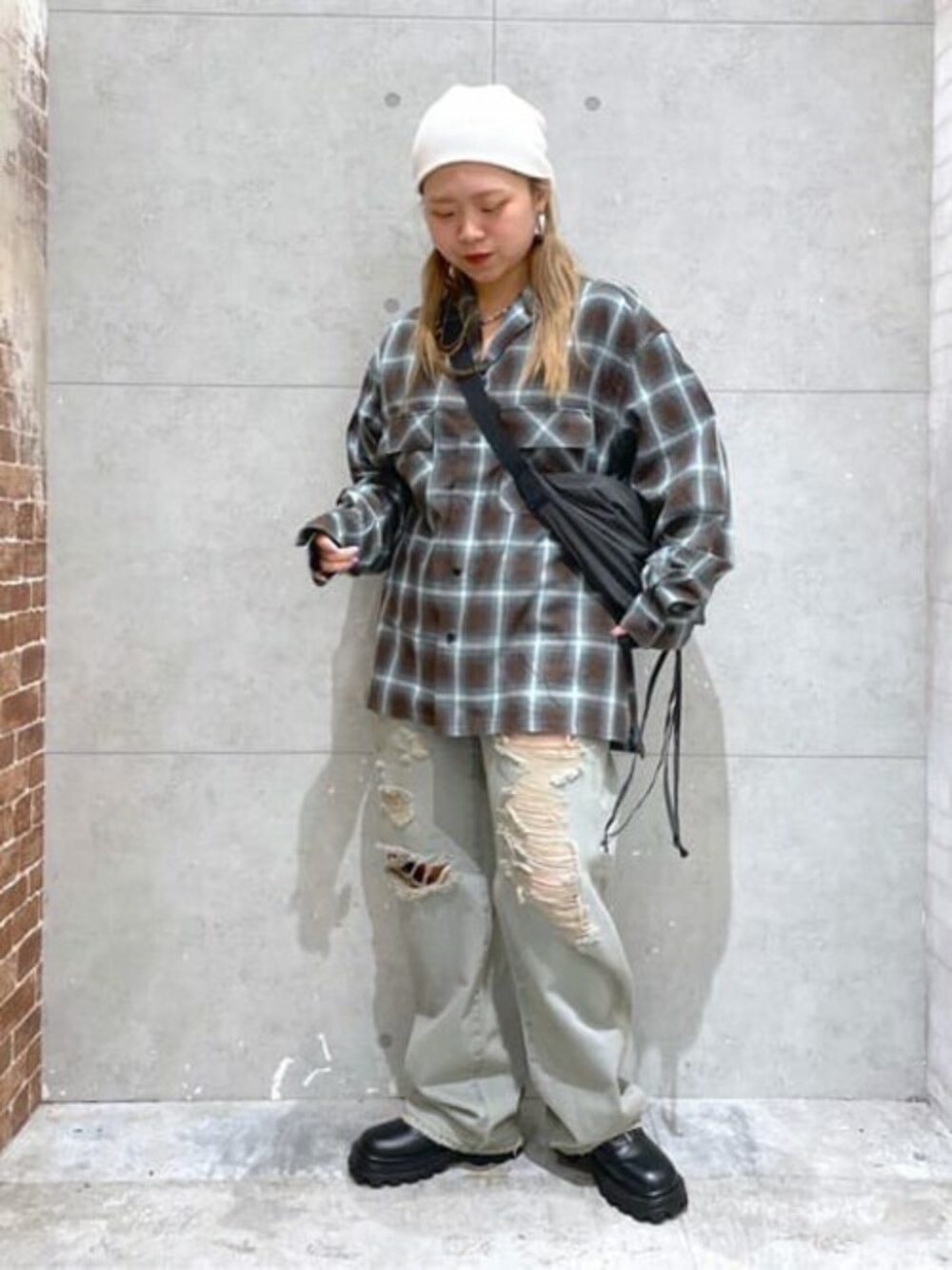 「古着っぽストリートコーデ」 シャツ/メンズアイテムなのでダボっとゆるさが可愛い💭 Lサイズだとよりダボっと感でるので大きめサイズおすすめです😇 パンツ/ウォッシュ加工やダメージ加工が最高に古着っぽい一本。 裾の溜まり具合が可愛いのでこれも大きめでも◎!