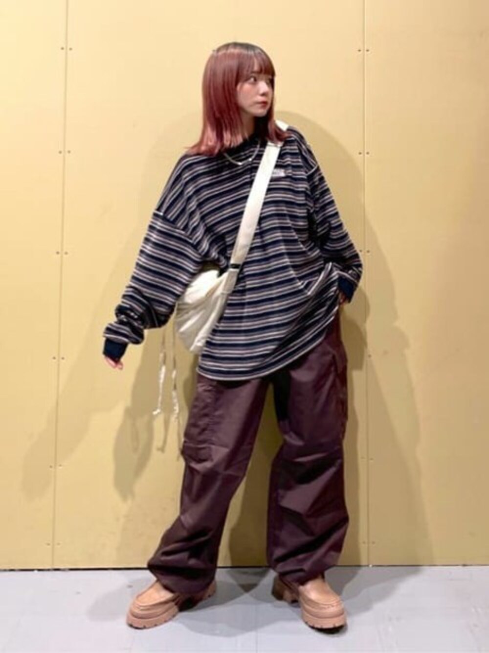 オールメンズアイテムでメンズライクコーデ 秋に入るので茶色中心にしたコーディネート ロンTはベロアで、秋冬春まで使用できる生地感です。 カーゴパンツは、ちょいダボシルエットなので、ダボっとさせたい方はいつもより大きめのサイズを選ぶのがおすすめ