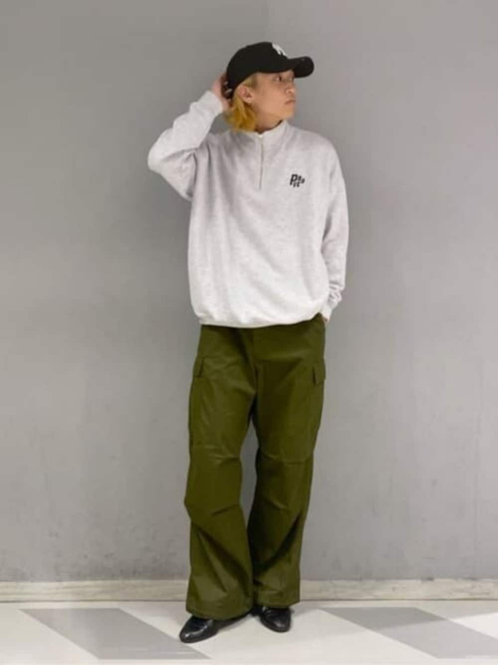 ハーフジップスウェットとカーゴパンツを使って、 ストリートコーデを組んだよ!! どちらのアイテムも着まわし抜群でかっこいい!✨ グレーとカーキの色の相性も最高だよ!👍