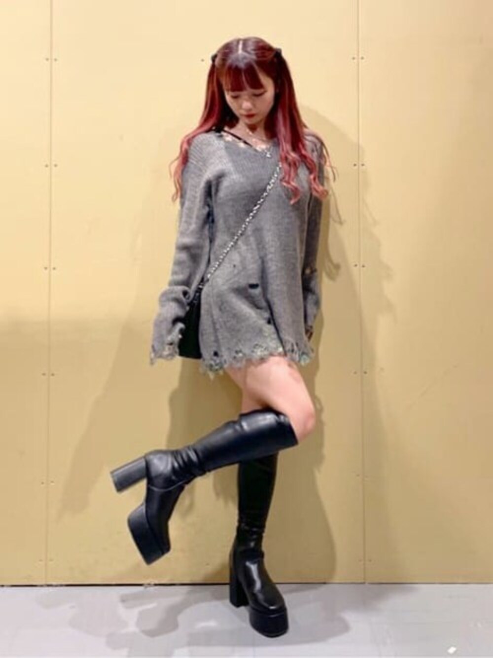 ダメージニットにロングブーツで 地雷、グランジ系に!!! フリーサイズですが、ワンピ風に着れる丈感です。