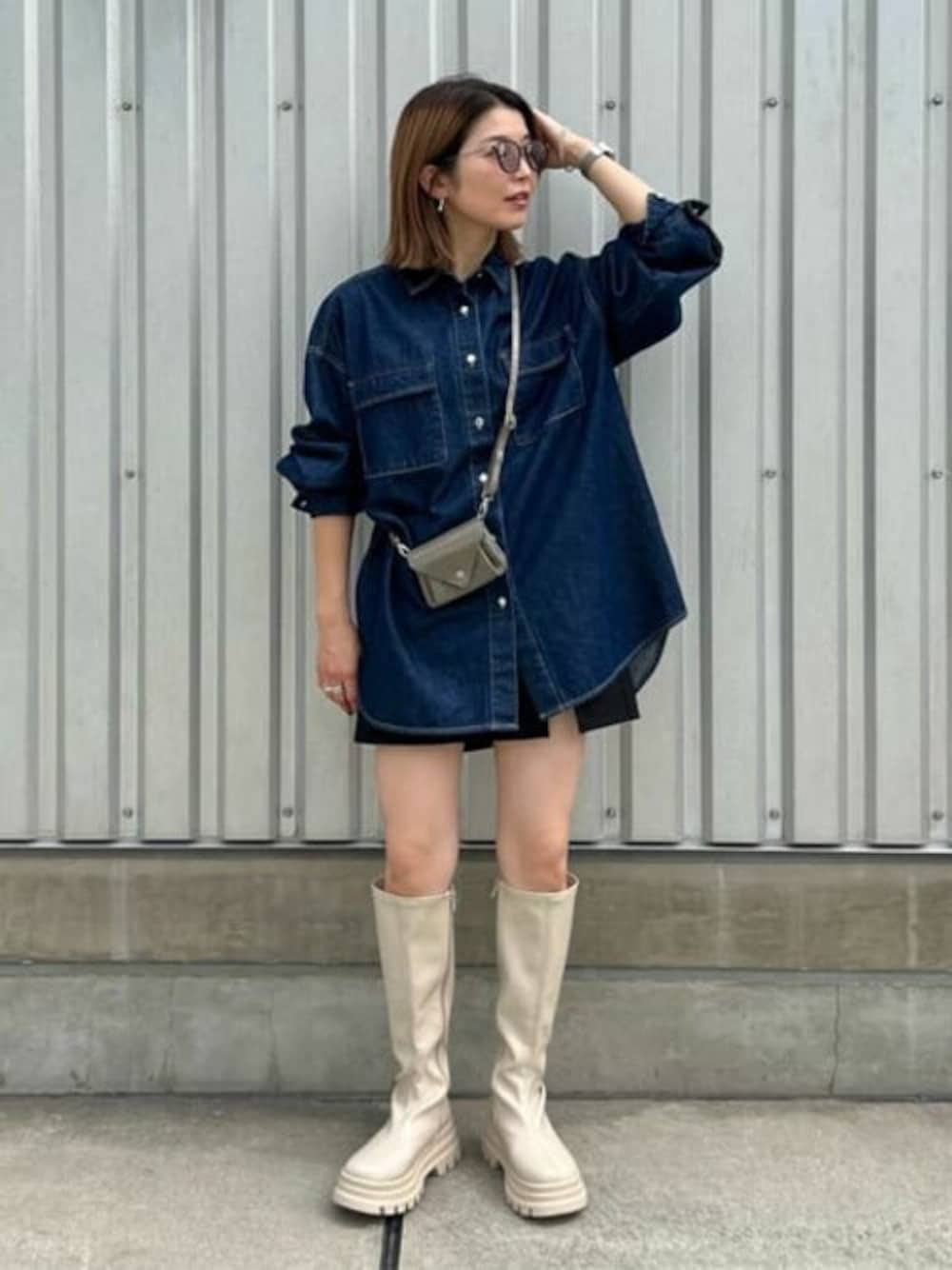 新作のデニムシャツが可愛い♡ オーバーサイズでワンピ風に着るのも◎ ロングブーツは足が綺麗に見えて盛れる‼︎ ブラックはもうお持ちの方はぜひホワイトも♡ ガーリーな雰囲気にぴったりです‼︎