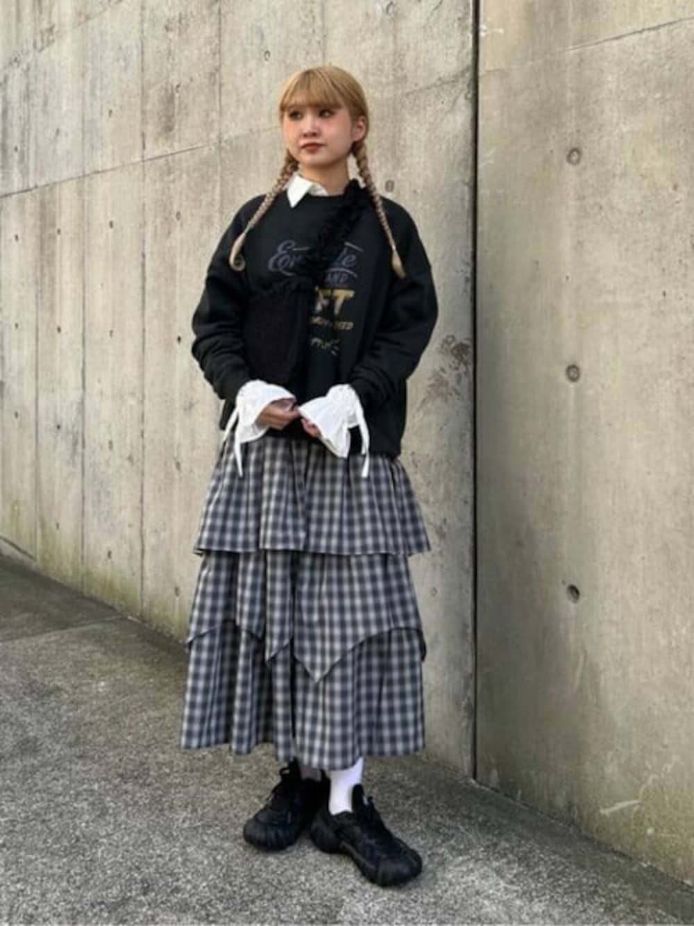 レイヤードコーデ◎ wcのリボンが可愛いシャツをヴィンテージライクなスウェットに重ね着して古着風! 片方だけシャツの襟を出すのが個性派でかわいい◎!!スウェットは大きめなのでアウトにしてスカートと合わせるのがおすすめ! スカートのチェックがグレーなので他のアイテムとの相性もgoodです!ちょっと気合い入れたいお出かけにおすすめのコーデです!