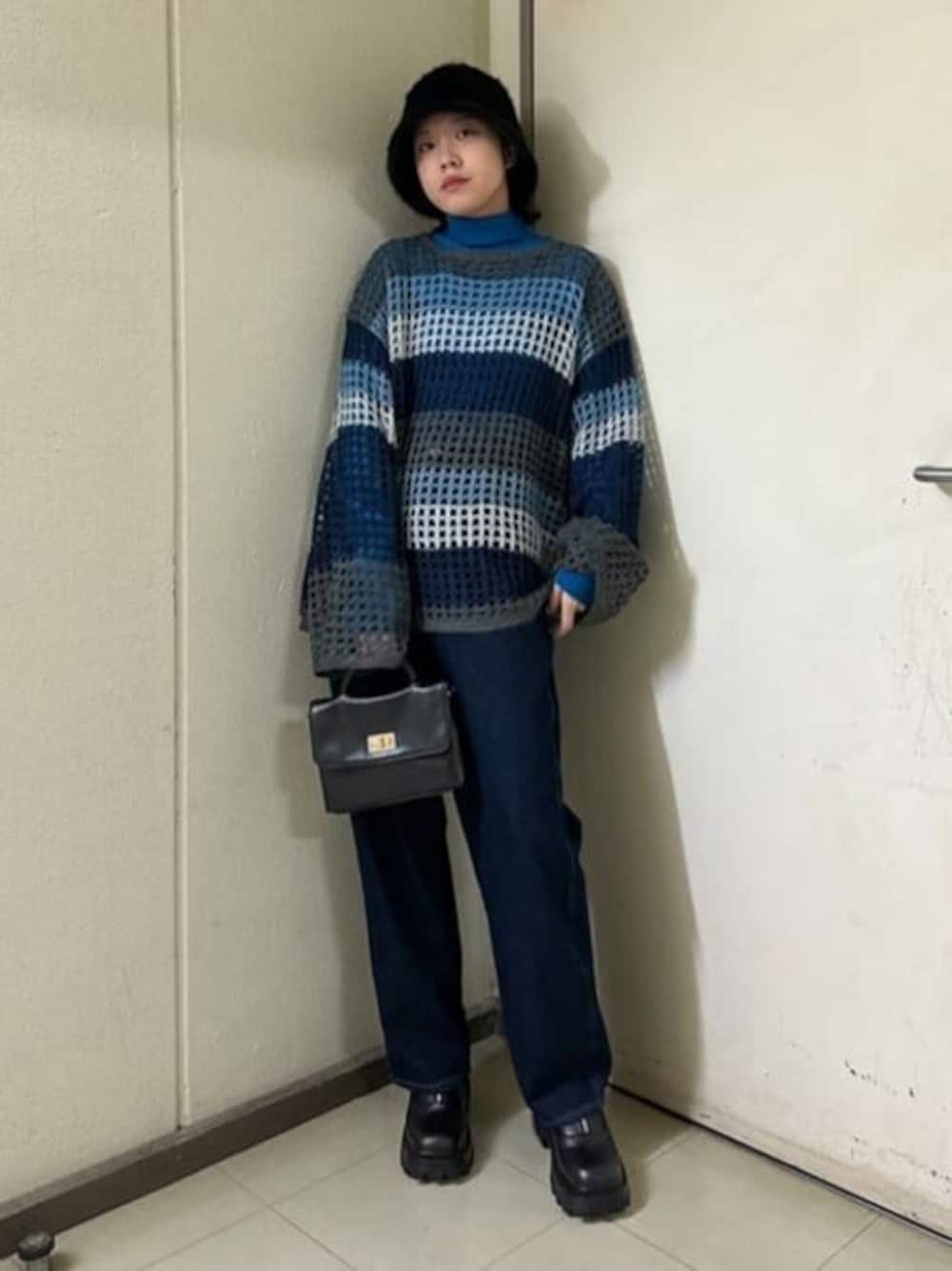 ★大人カジュアル★ ブルー×ブラックでまとめてみました! メッシュニットのインナーにタートルニットを着ておしゃれ防寒♪