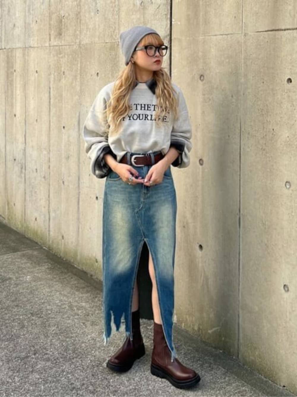 アメカジ風スタイル◎! ロゴジャガードニットと、チェックシャツの組み合わせは店頭でも大人気のスタイル! 袖を織り込むことでこなれ感◎ 小物でブラウンを入れることで、大人カジュアルな雰囲気に◎ ロングスカートはスリットが足長効果!