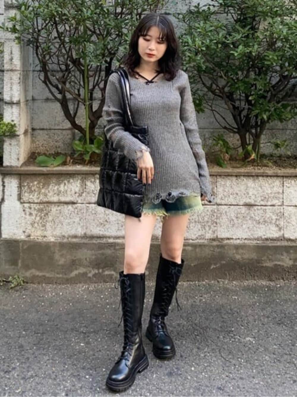 ロングブーツとショートパンツで合わせた王道秋冬の大人ガーリーコーデ! 私のオススメ!ダメージニットプルオーバーはデザインも可愛いくて生地感も気持ちくて着回ししやすいアイテムです♡ ブーツも長時間履いていても全然疲れないです!靴擦れもしにくいです◎!