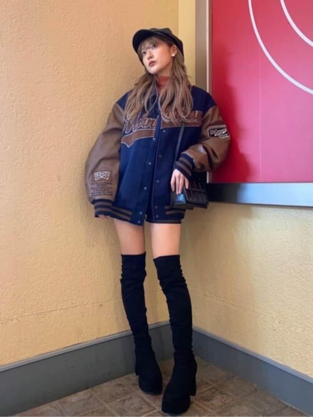 着用しているアウターはメンズ商品のワッペンスタジャンになります♡ メルトン素材であたたかく、女の子が着用するとオーバーサイズ感がとても可愛いです(-_-) 154センチの私はMサイズを選びました!