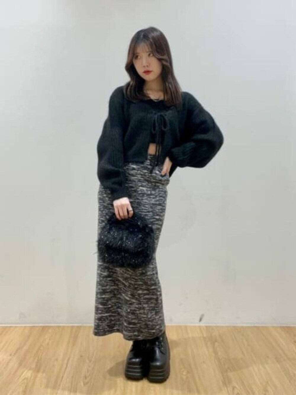 【アンサンブルニットリボンカーデ】 キャミとセットになった万能アイテム! 肩を落としてオフショル風に着用しても◎ 【ニットリブスカート】 リブニットなので、タイトスカートでも歩きやすい! ミックスカラーでモード系のスタイリング◎ 【ボリュームレースアップショートブーツ】 8.4cmの厚底でスタイルアップ! 【ファーフラップショルダー】 ハンドバッグ、ショルダーバックの2WAYで使用◎