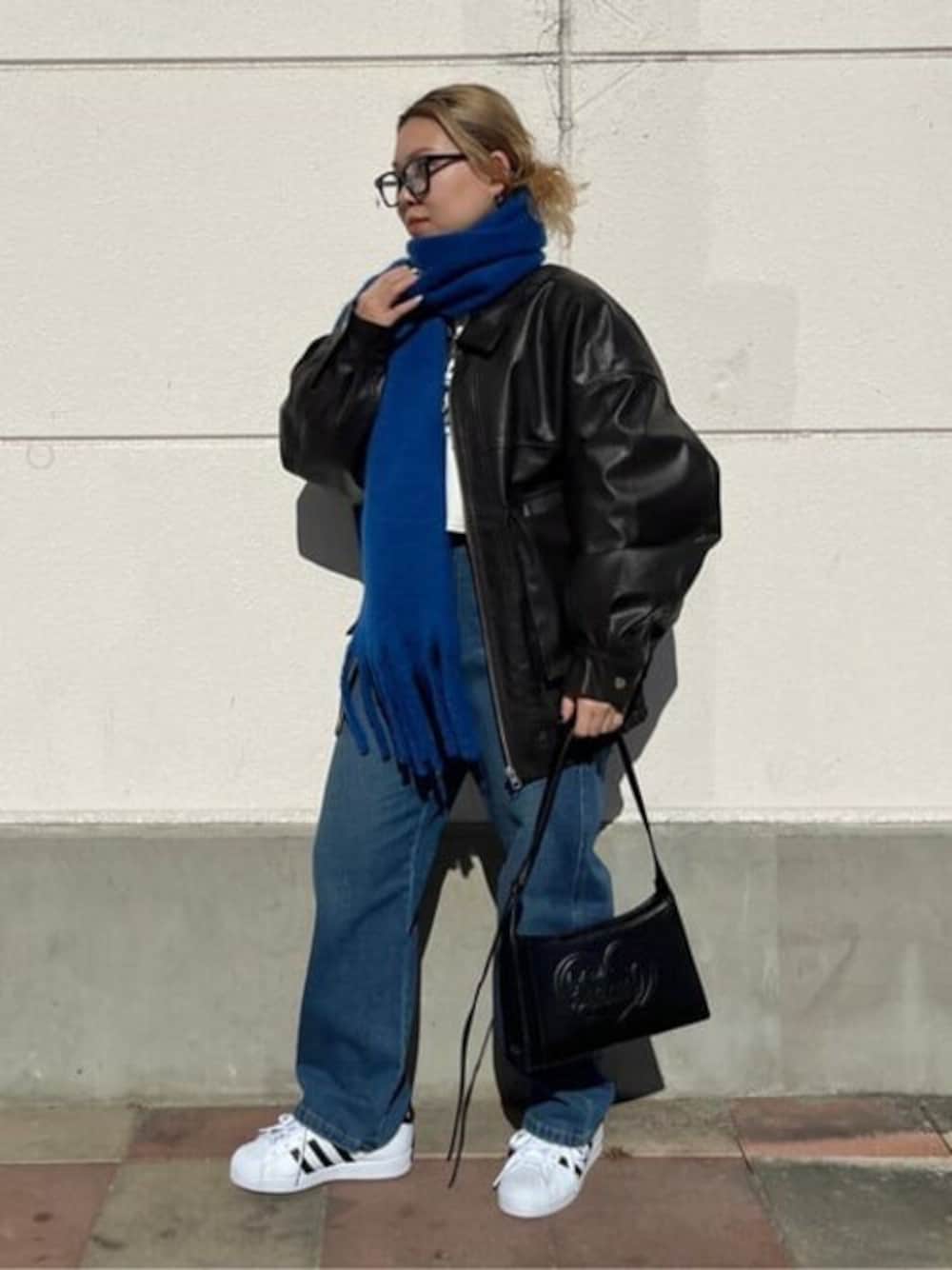 <大人カジュアル> 全体的にモノトーンでまとめてストールをアクセントにしてるのがポイントです! ジャケットはオーバサイズでかなりゆったりしているので厚手のトップスも難なく着込めます◎ ストールはしっかりとした生地でとっても温かかったです!! 巻くだけでなく手持ちスタイルもお洒落ですよ♪