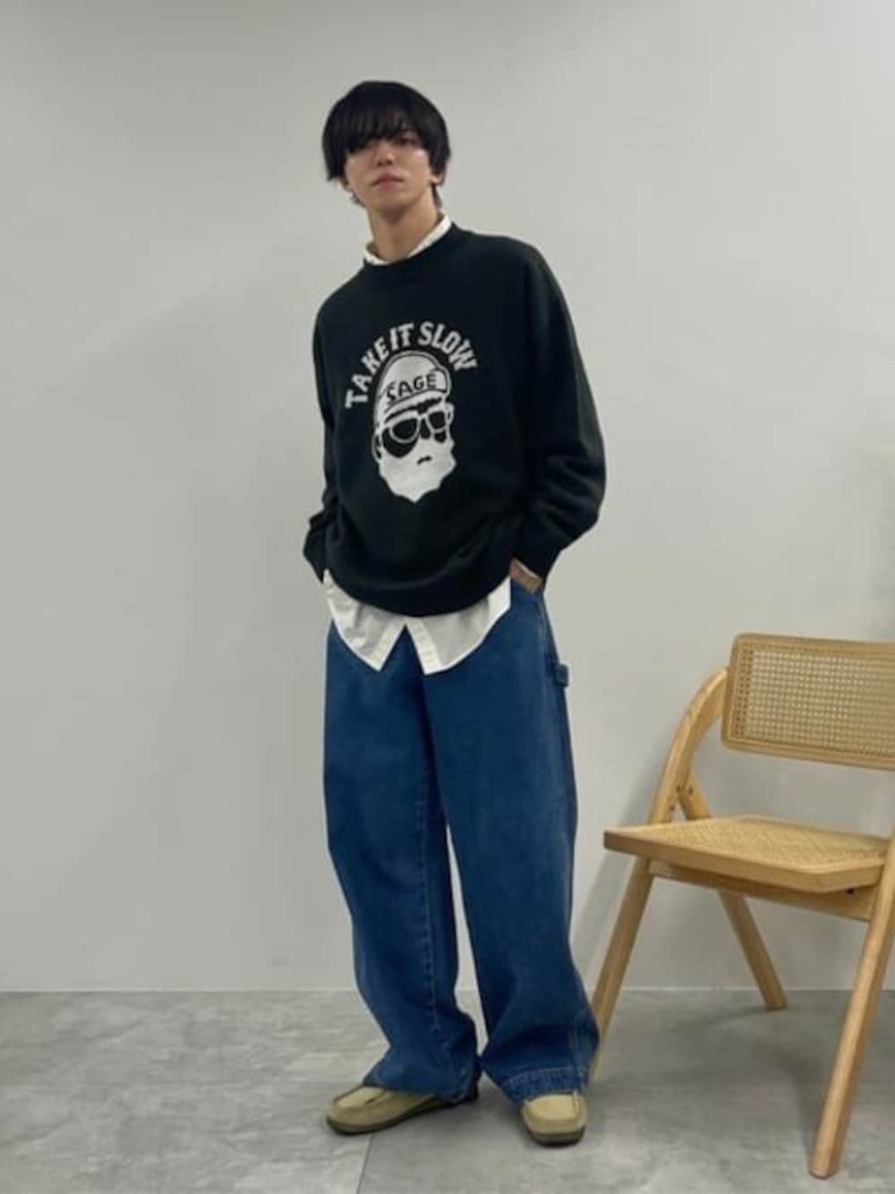 おじさん柄が目を引くニット! 柄のカラーに合わせて白のシャツを合わせてみました。 こちらのニットはオーバーフィットでデカすぎないサイズ感がレイヤードのしやすいアイテムになっているので インナーにシャツやTシャツなどをレイヤードするスタイリングがオススメです◎ パンツにはデニムを合わせて全体的にゆるダボッなコーデにしてみました。 メンズライクが好きな女性のお客様にもオススメのコーデになっています。