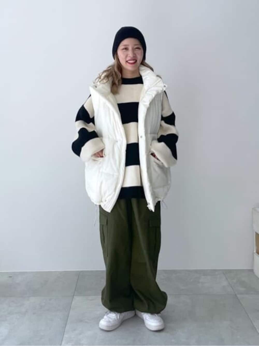 ニットにベストは間違いない! これ合わせれば暖かい上に お洒落見え効果◎ ニットは手触りモチモチで ボーダーがかわいいです! カーゴパンツはメンズ品番だけど 紐があるのでレディースも着れます^ ^